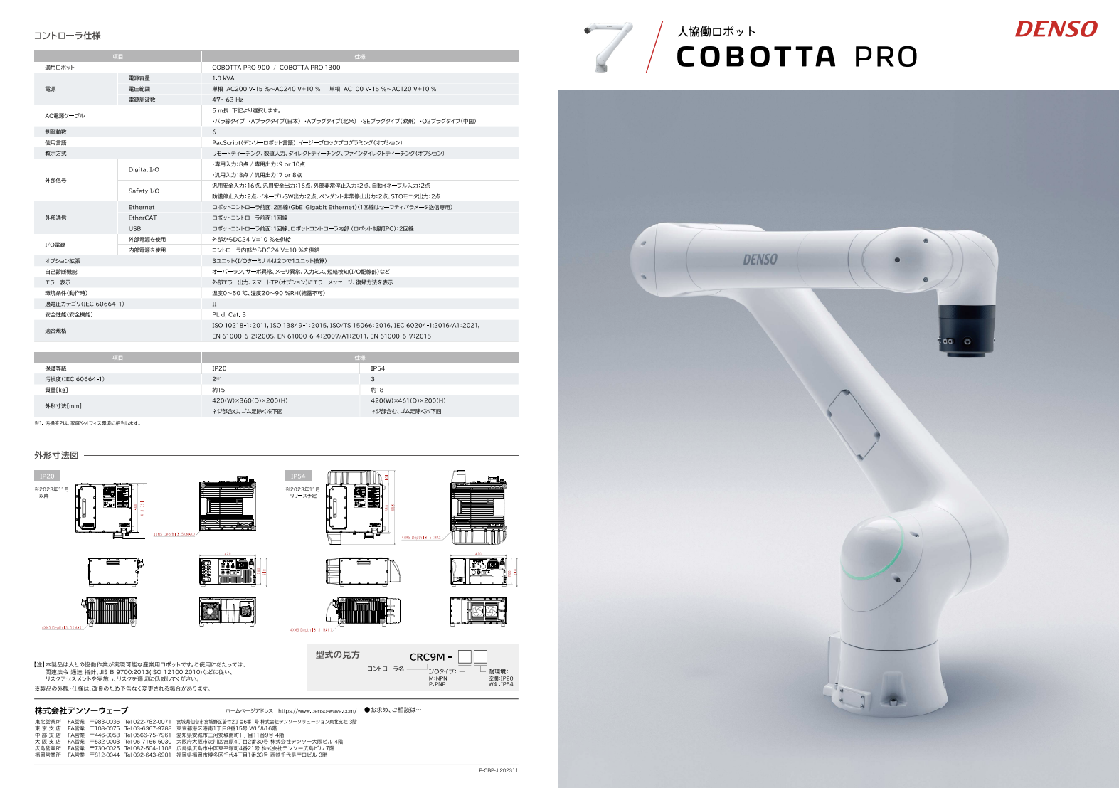 デンソーウェーブの人協働口ボット「COBOTTA PRO」の各製品の特徴やスペックを一目で比較できる資料です。