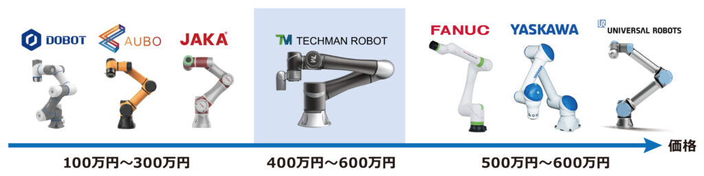 テックマンロボットは、本体価格がおよそ 400〜600万円前後とされ、協働ロボット市場の中では中価格帯〜やや上位クラスに位置します。一方、中国メーカーの DOBOT、JAKA、AUBO などは 100〜300万円程度の低価格帯にあり、手頃な導入コストが魅力です。また、FANUC や 安川電機 の協働ロボットはおおむね 500〜600万円前後と、TMと近い価格帯にあります。